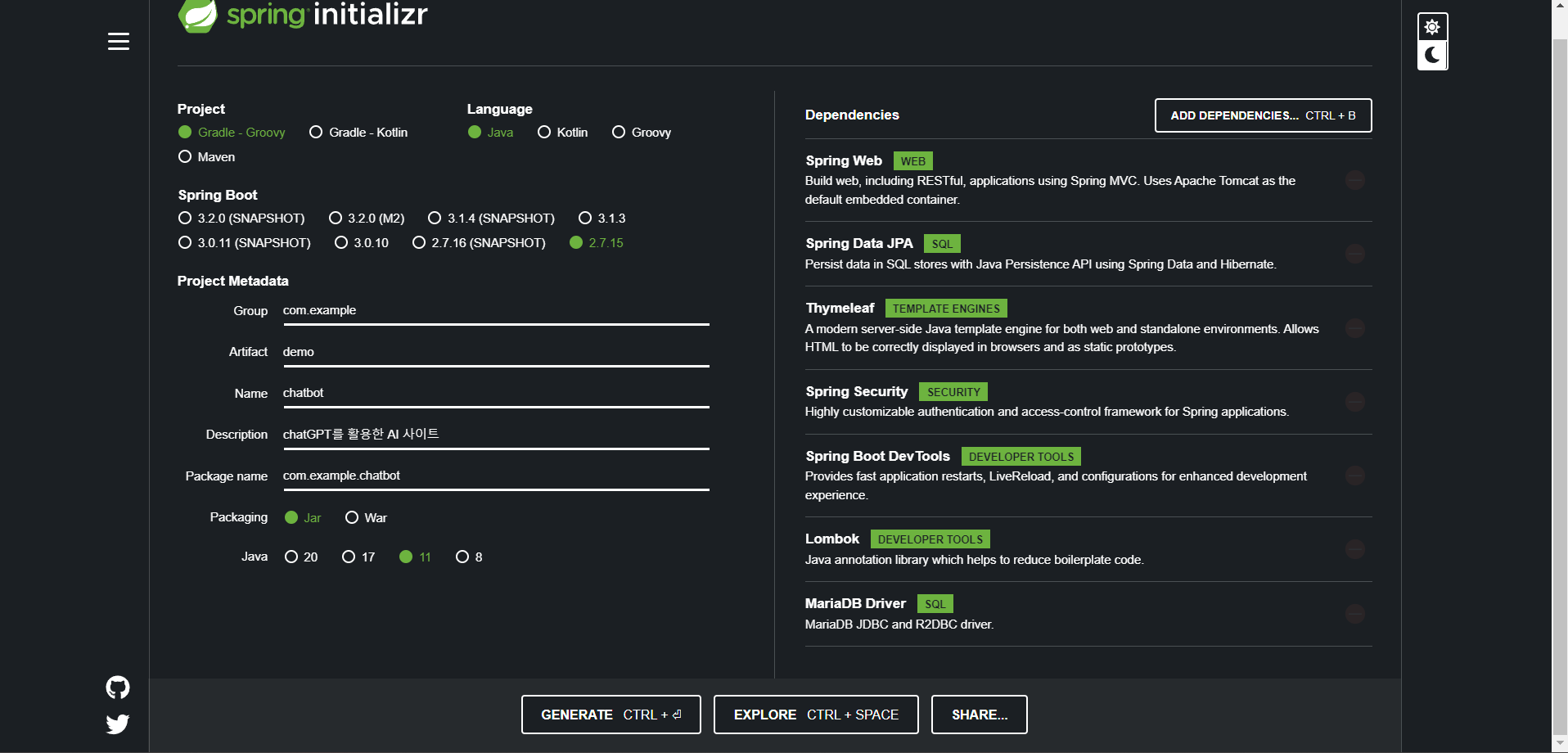 https://start.spring.io 여기로 들어가면 바로 프로젝트 만들 수 있다.