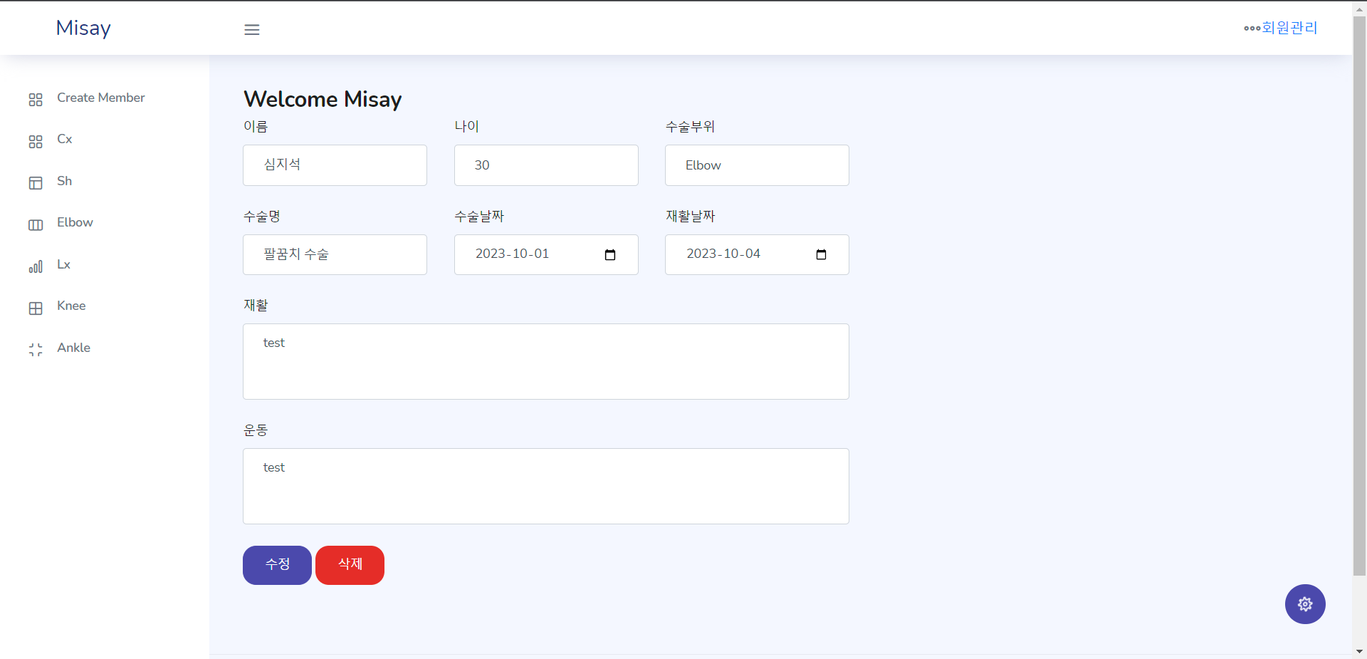 제 이름으로 회원을 등록해서 '회원관리' 버튼을 누르면 위 사진처럼 화면이 나오고