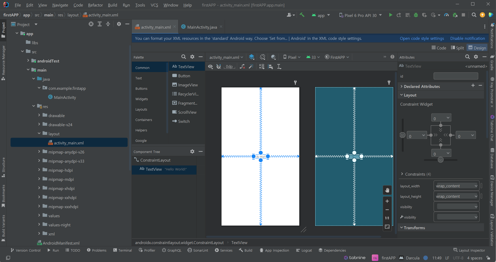 activity_main.xml또한 자동으로 만들어지는데 어떻게 구성돼 있는지 보겠습니다.