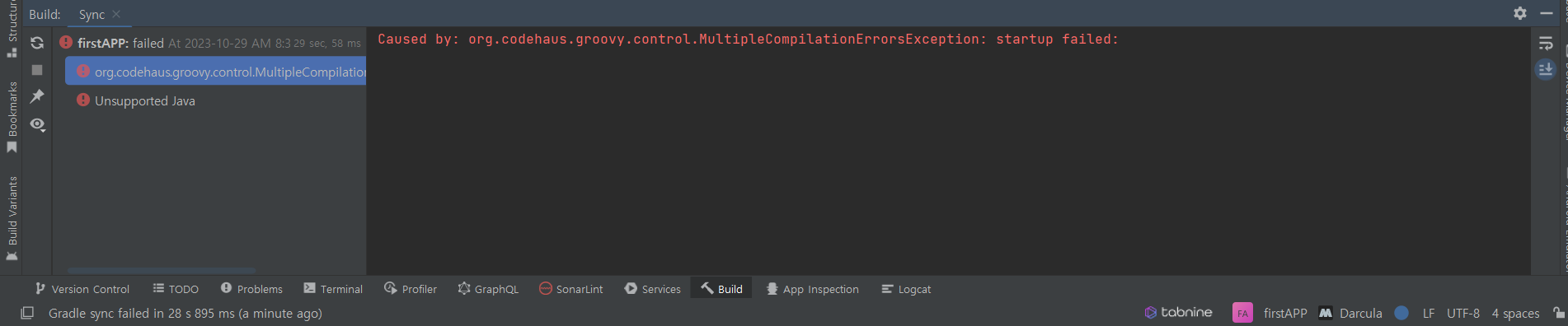 콘솔창에 또 에러가 나왔다. 내용을 확인해보니 Android API 34 버전 이상이여야 하는데 내 프로젝트는 33버전이라 업데이트를 해야한다고 한다.
