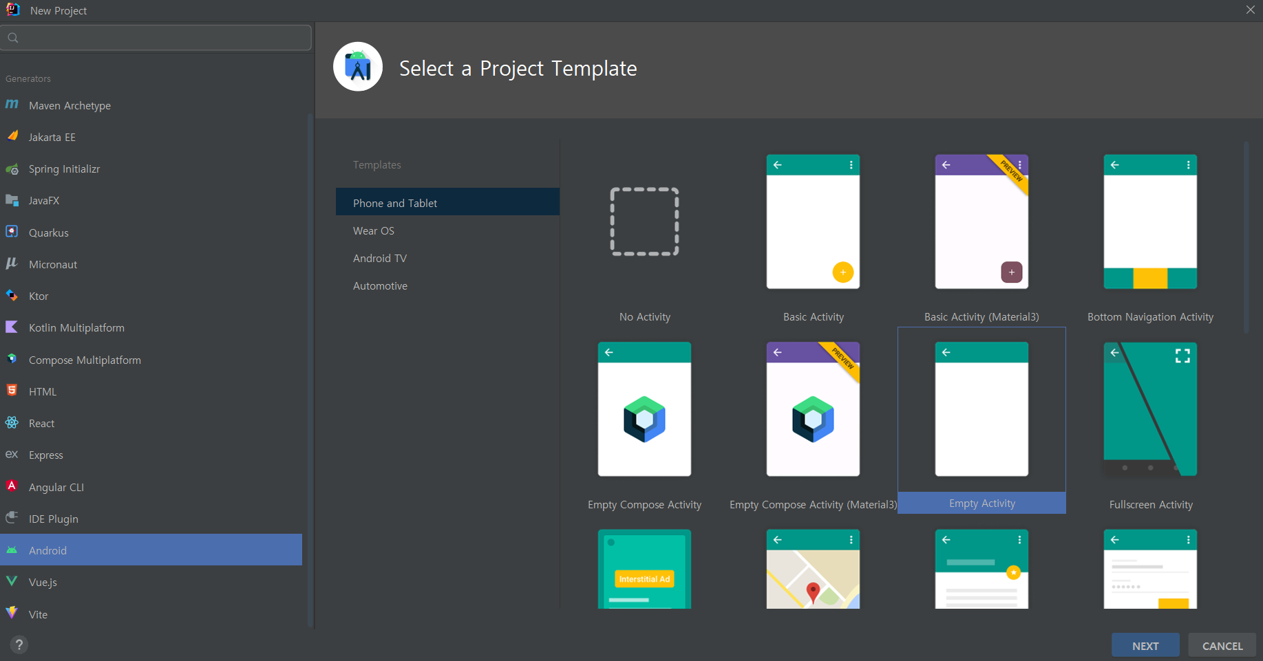 Android 선택 → phone and Tablet 선택 → Empty Activity 선택 → NEXT 누릅니다.