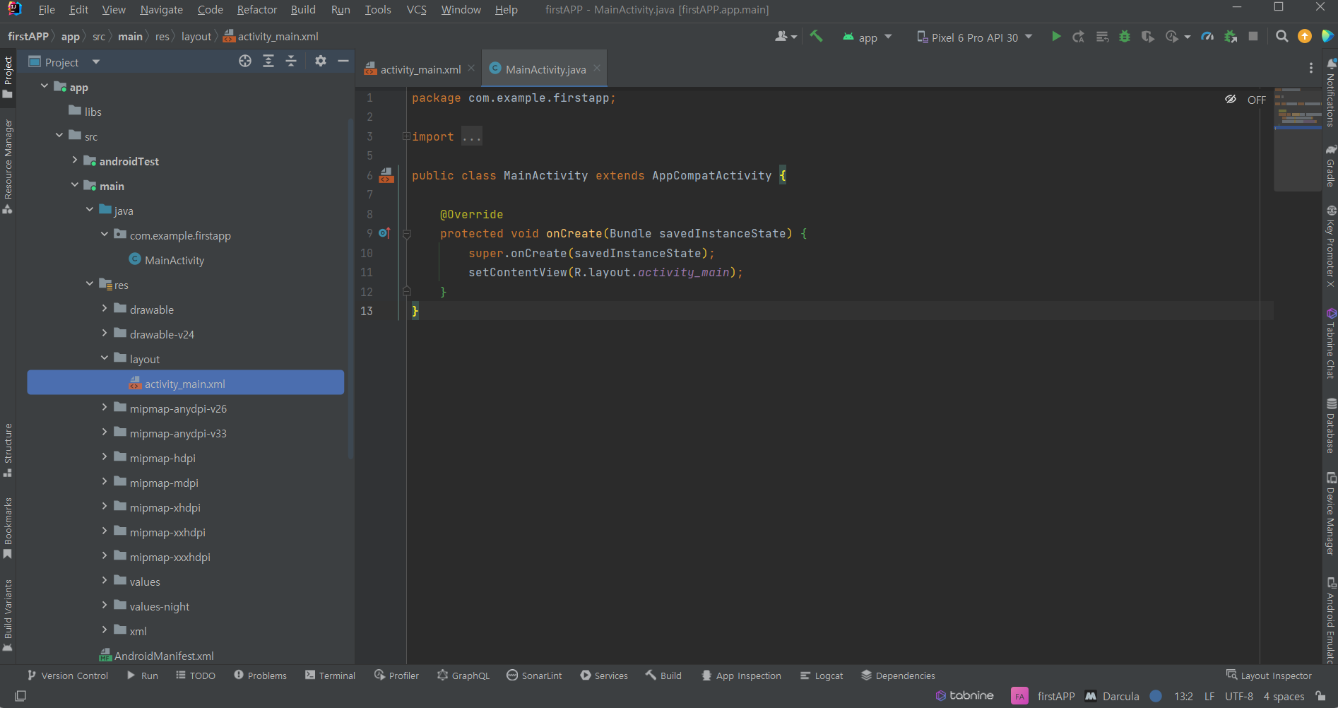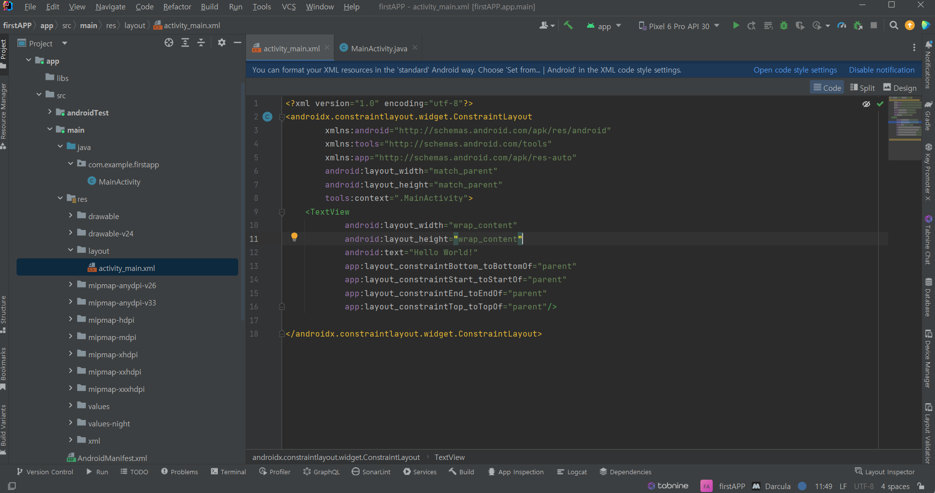 activity_main.xml또한 자동으로 만들어지는데 어떻게 구성돼 있는지 보겠습니다.