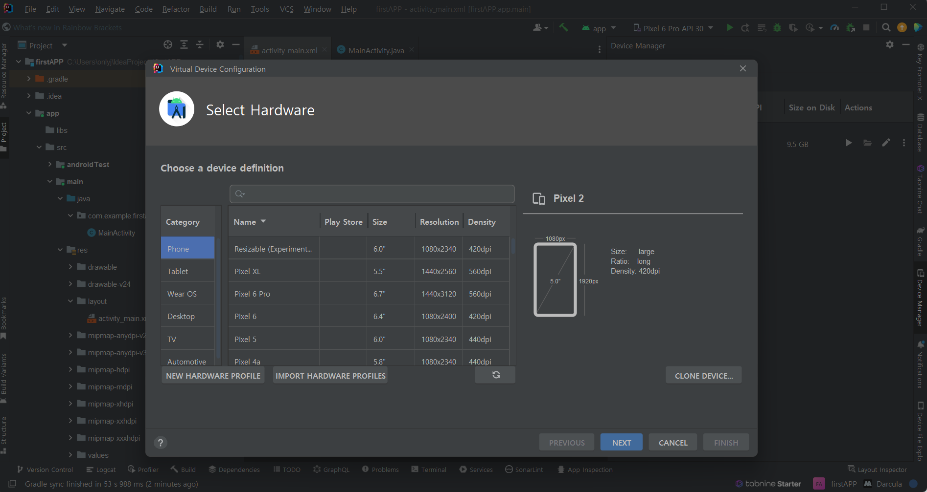실제 기기에서 실행할 수 있고 가상 스마트폰 or 태블릿을 사용할 수 있는데 가상 스마트폰을 만들어서 실행해보겠습니다.