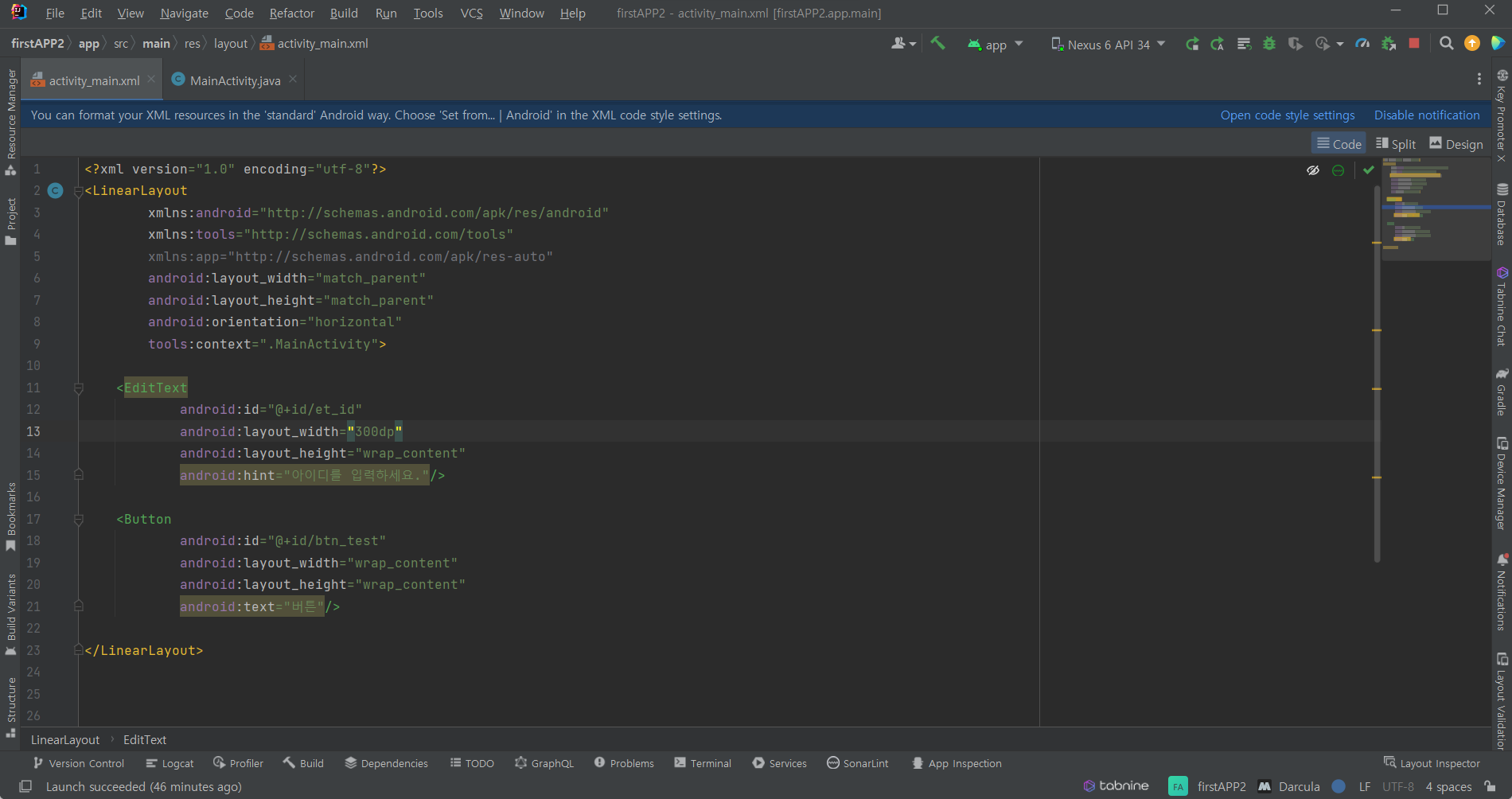 <EditText>와 <Button>을 만들었습니다. <Button>은 말그대로 버튼이라 따로 설명이 필요없지만 <EditText>는 HTML알고계신 분이라면 <input>태그와 똑같습니다. 만약 HTML을 모른다면 우리가 로그인할때 아이디나 패스워드 입력받는 곳을 말합니다.