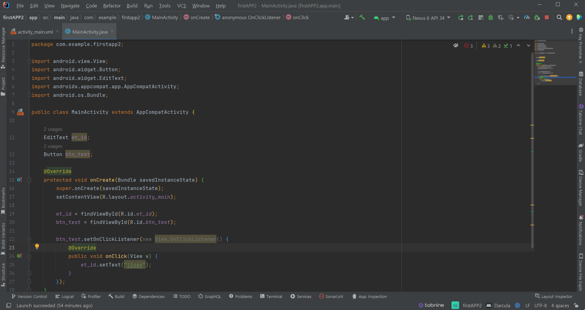 EditText와 Button을 선언합니다. 이때 변수명은 XML에 정의한 id 그대로 해주는게 좋습니다. (나중에 많아지면 헷갈립니다.)