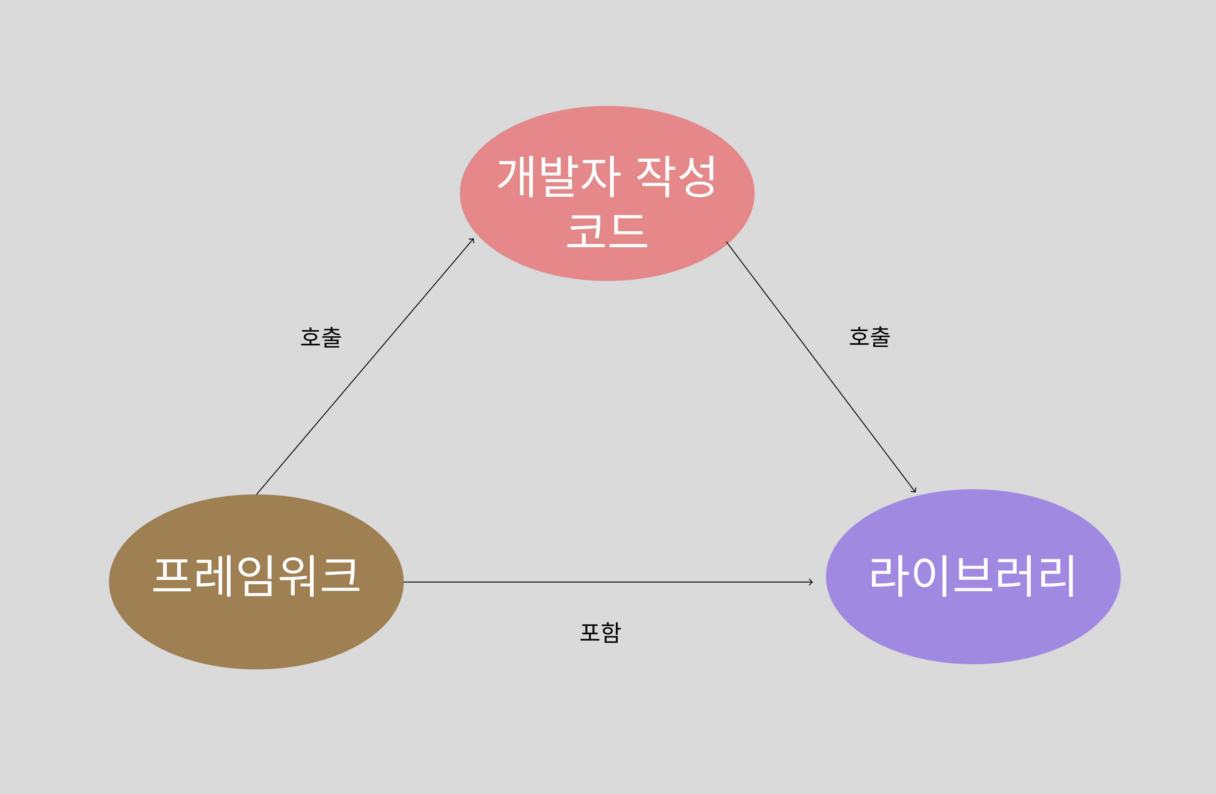 프레임워크는 라이브러리를 포함하며 프레임워크 위에 개발자가 작성한 어플리케이션 코드가 올라가게 되고, 이 어플리케이션 코드에서는 라이브러리를 호출할 수 있다. 이처럼 프레임워크와 라이브러리의 가장 큰 차이점은 제어 흐름 이 어디에 있는가이다.