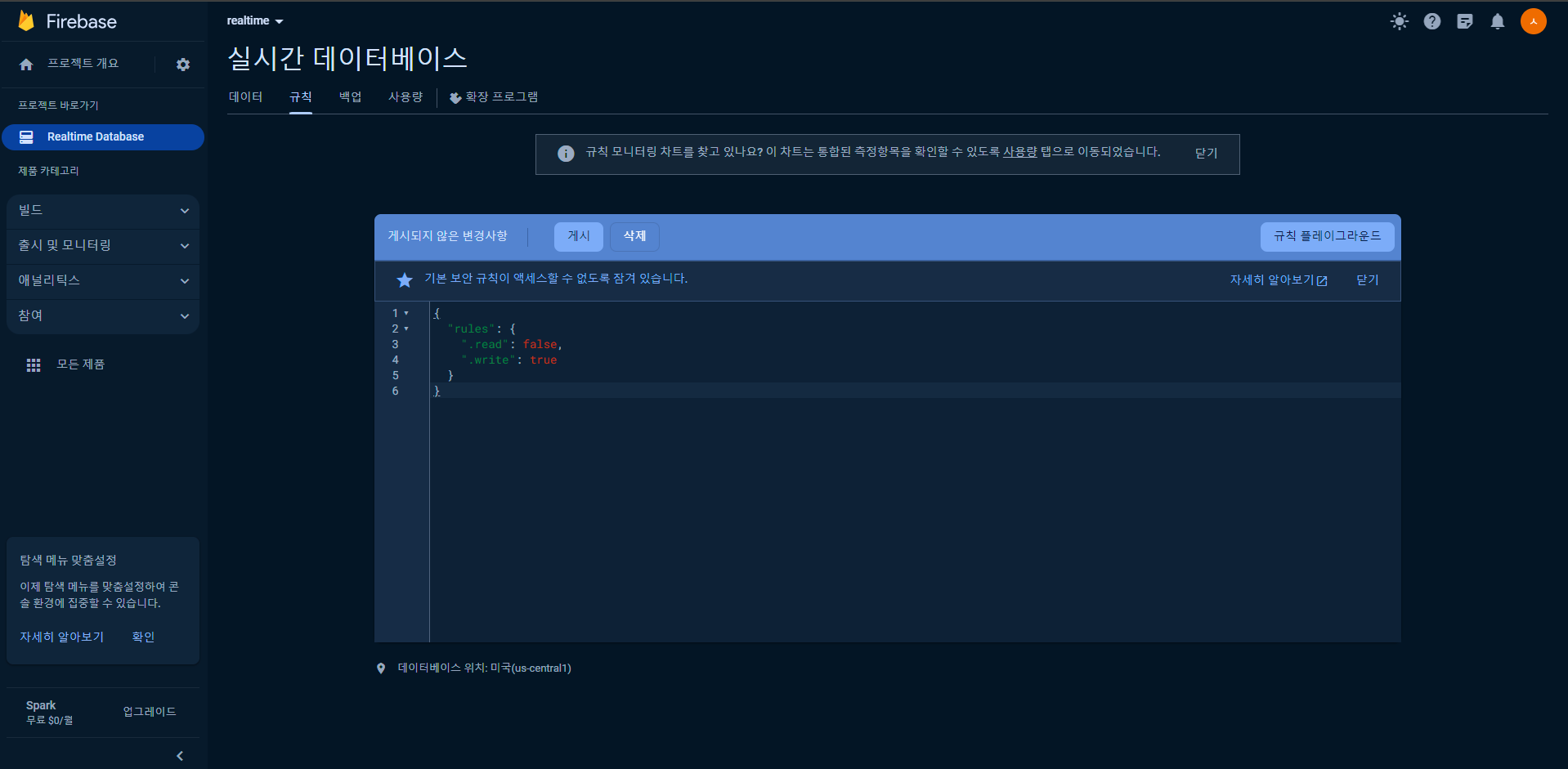 그리고 규칙에서 write를 true로 변경해줍니다. 그 이유는 콘솔이 아닌 안드로이드 프로젝트에서 DB접근하기 위해 true로 합니다.