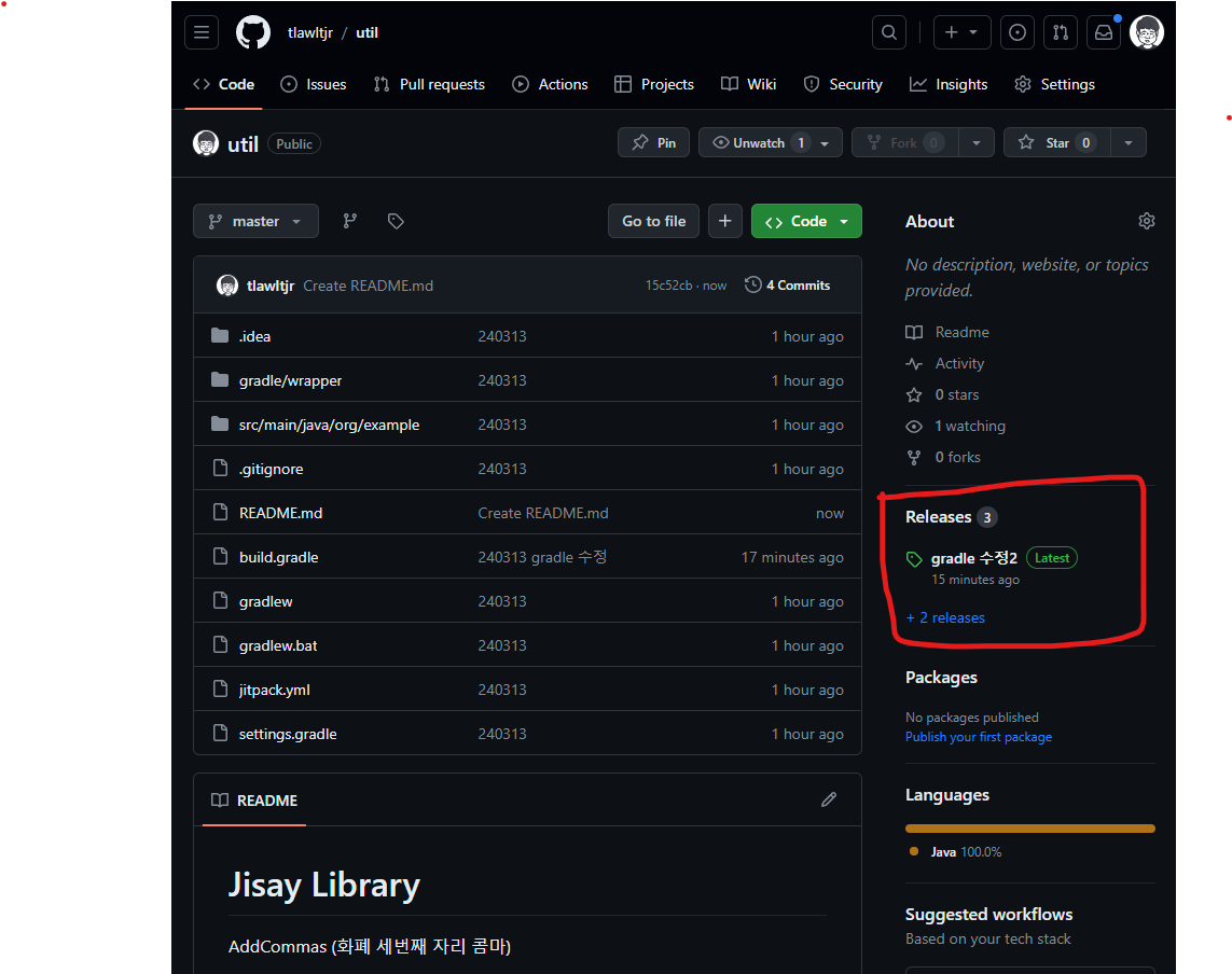 빨간 네모칸에 releases가 보이는데 release를 만들어 줍니다.