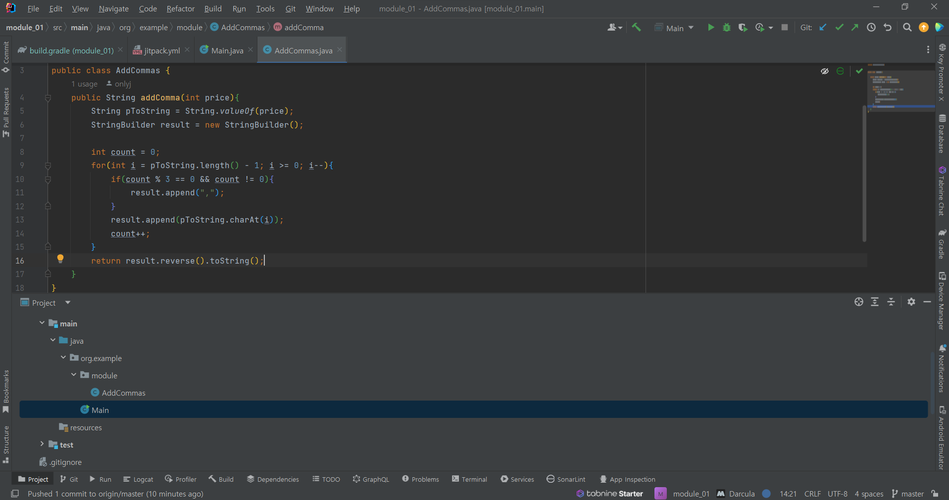 간단하게 gradle 프로젝트로 화폐 세번째 자에 콤마를 찍어주는 메소드를 만들었습니다.