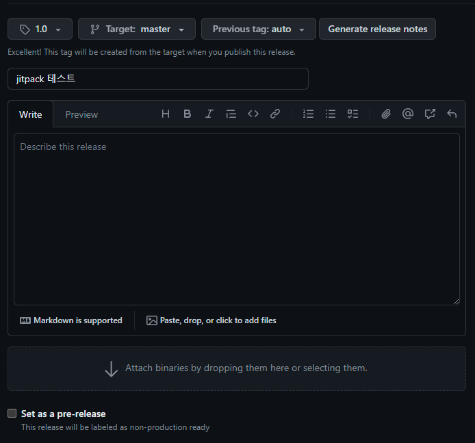 릴리즈 태그를 쓰고 제목과 내용을 써줍니다.