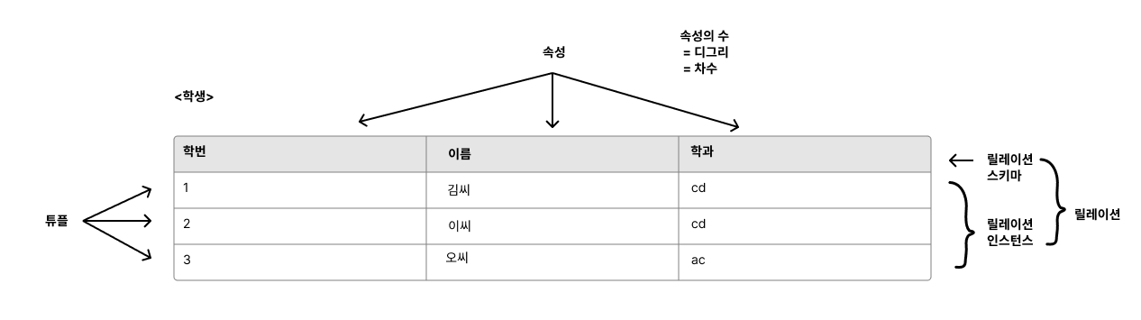 ( 1 ) : 릴레이션을 구성하는 각각의 행을 의미하며, 파일 구조에서는 레코드에 해당함