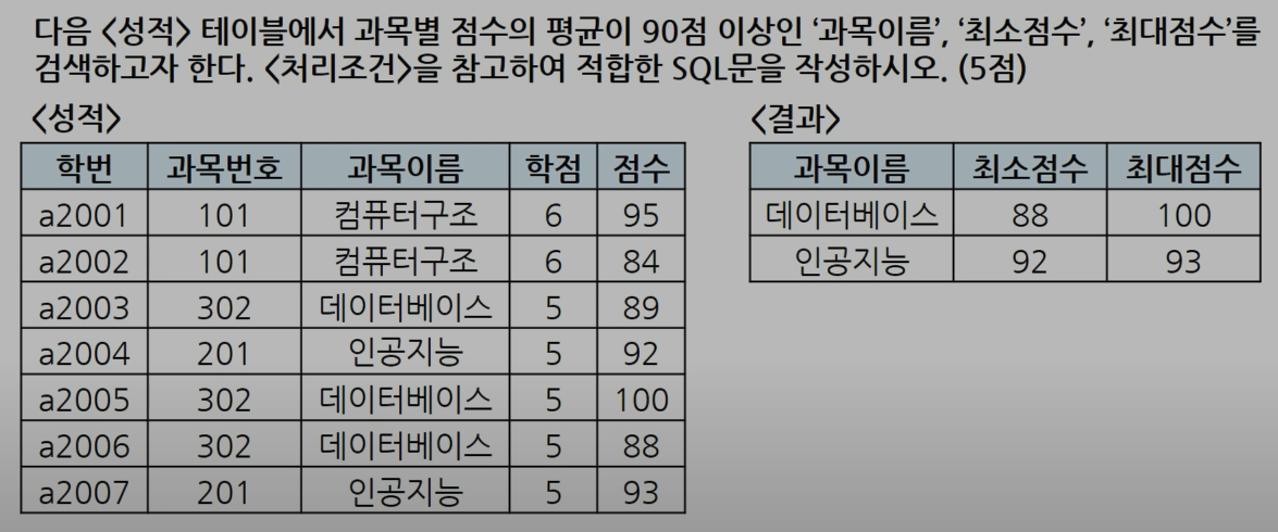 GROUP BY 과목이름 HAVING AVG(점수) >= 90;